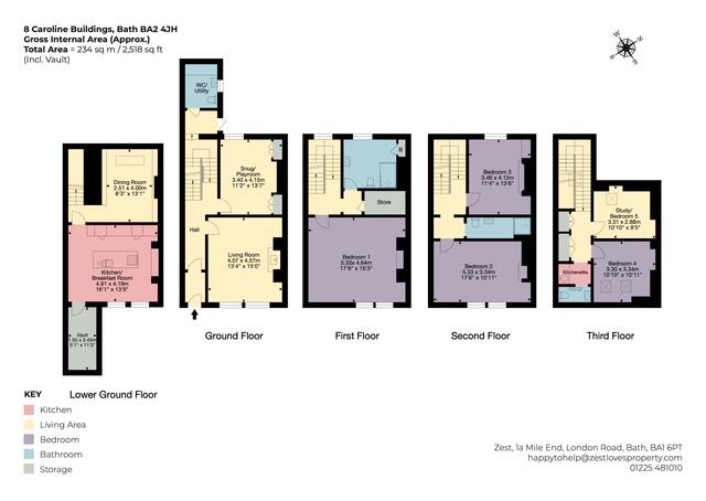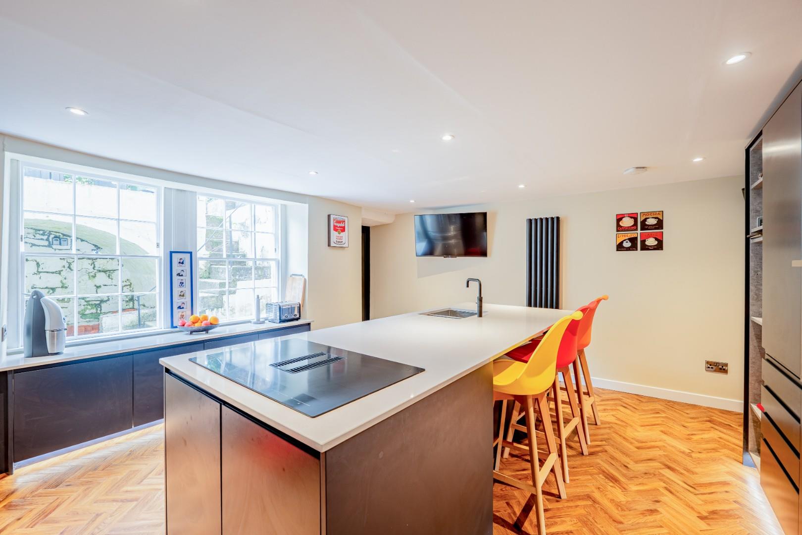 Nestled in the sought-after heart of Widcombe, this exquisite Grade II listed Georgian residence effortlessly combines period charm with stylish, contemporary living. Thoughtfully updated throughout, the property retains its original character while offering all the comforts of modern design. The ground floor welcomes you with a spacious, light-filled living room featuring a sleek modern log burner—perfect for cozy evenings. A second reception room, currently arranged as a games room, adds versatility to the layout. A well-proportioned utility room with a W.C. completes this level. Downstairs, the beautifully appointed kitchen is a chef’s dream, blending modern fittings with characterful touches including the original stove fireplace. A separate dining room and vaulted storage areas enhance the practicality and charm of this level. The first floor hosts the impressive principal suite, complete with a private shower room and ample storage. Two further double bedrooms occupy the next floor up, sharing a contemporary shower room. The top floor currently serves as a flexible space with a home office, additional bedroom, W.C., and a convenient kitchenette—ideal for guests or multi-generational living.